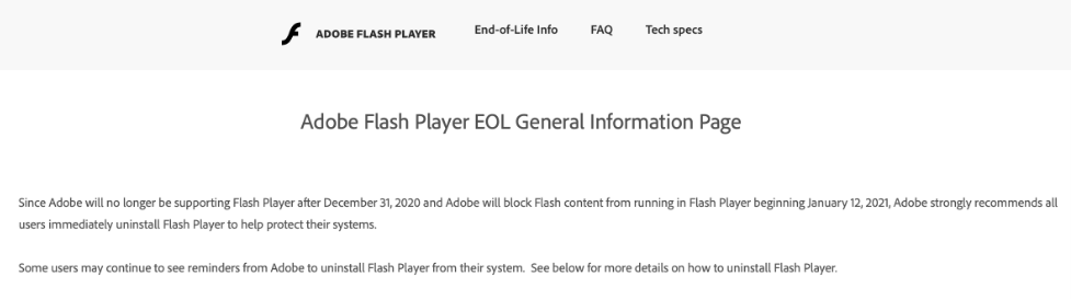 어도비(Adobe)사는 2020년 12월 31일부로 어도비 플래시 플레이어(Adobe Flash Player)를 지원하지 않으며, 2021년 1월 12일(화)부터 플래시 콘텐트가 플래시 플레이어에서 실행하는 것을 모두 차단할 것이라고 공식 발표했습니다. 이에 따라 모든 사용자는 시스템 보호를 위해 플래시 플레이어를 즉시 제거할 것을 강력히 권고하고 있습니다.