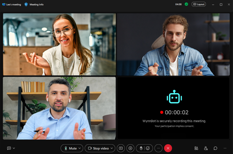 AI 기반 회의기록시스템은 회의 일정을 사전에 등록하거나 외부 캘린더(Google Calendar 등)와 연동하여 자동으로 회의 정보를 인식합니다. 지정된 시간에 맞춰, 가상 참석자인 ‘윈봇’은 회의에 자동 입장하여, 회의 전 과정에 거쳐 회의 화면과 음성을 실시간으로 캡처하고, 이를 레코딩 서버로 전송하게 됩니다.